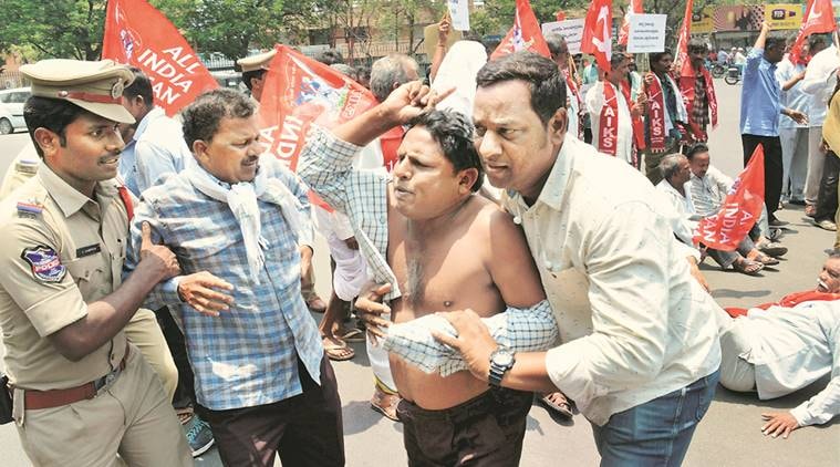 Hyderabad: Police detain chilli farmers, who were staging a protest against various issues, including fall in prices of the crop, at the T S Agriculture Commissionerate in Hyderabad on Wednesday. PTI Photo