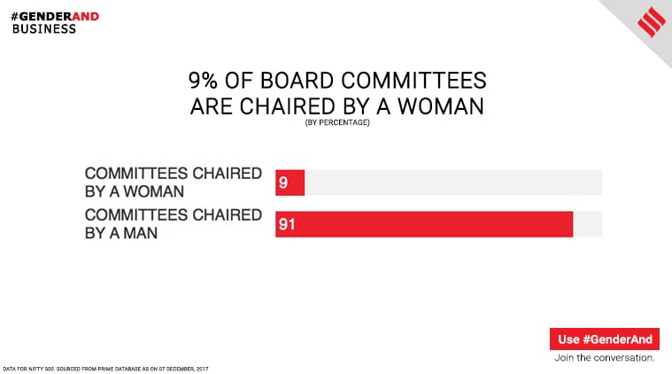 The NIFTY500 companies had 3,329 committees combined with more than 11,189 members (as per data accessed on December 7, 2017). Several individuals were members on multiple committees. Women made up 11 per cent of all committee members across the companies. Simply put, 381 women occupied 1,209 committee seats, whereas 2,711 men occupied 9,980 committee seats. The proportion of women thinned down further when it came to chairpersonship of these committees. For 2,797 committees (where chairpersonship data was available), a bare nine percent were chaired by a woman.