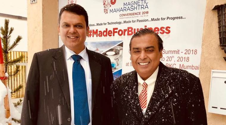Maharashtra CM Devendra Fadnavis with Reliance Industries chairman at Maharashtra Pavilion at Davos.