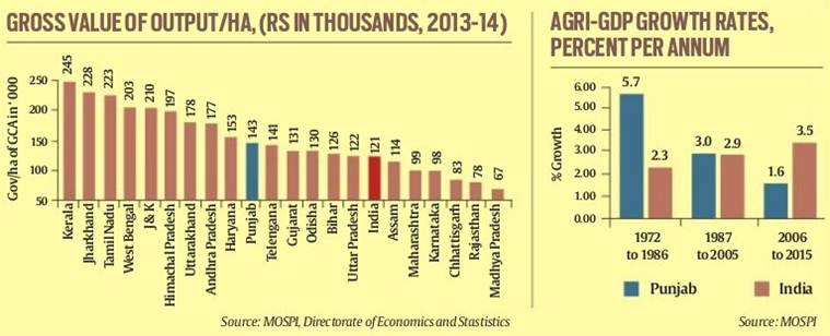 Punjab was Indian agriculture’s star performer during the Green Revolution’s heyday. The state averaged an agri-GDP growth of 5.7 per cent per annum between 1972 to 1986, more than double the all-India average of 2.3 per cent in the same period. But thereafter, the Green Revolution began to gray. The growth rate of Punjab’s agriculture fell to 3 per cent per between 1987 to 2005 — almost the same as that of the 2.9 per cent growth rate registered by the country in agriculture during this period. Between 2006 and 2015, the state’s agri-growth rate plummeted to 1.6 per cent — less than half the all-India average of 3.5 per cent (see Graph 1). During this period, states such as Madhya Pradesh registered a growth rate of more than 9 per cent in agriculture.