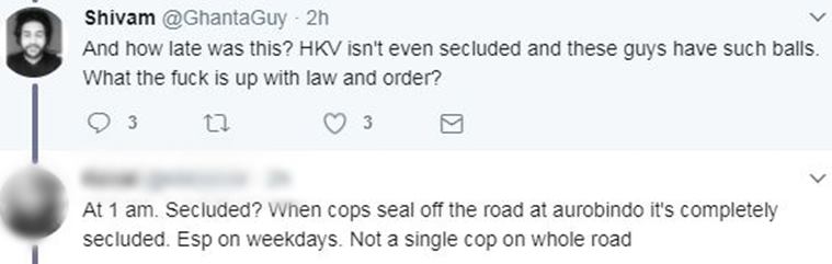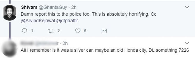 “I spoke with the Additional DCP South Delhi, and the SHO Safdarjung. I explained the incident and have provided all the details I had, like timing, location, partial number plate,” she wrote. “The cops are on it, as well,” she concluded.