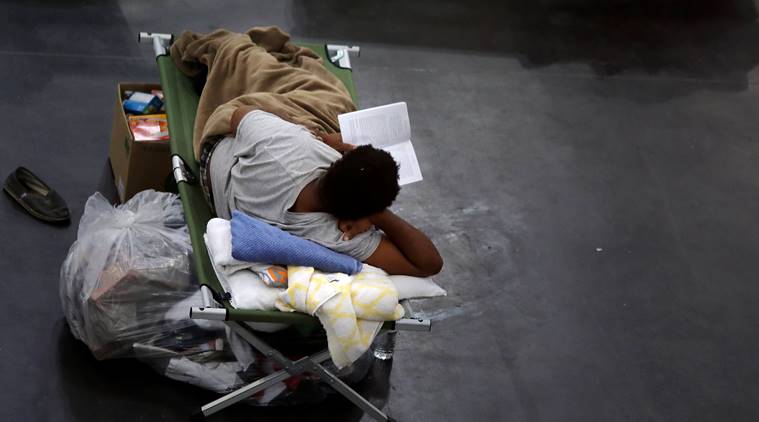 An evacuee affected by Tropical Storm Harvey takes shelter at the George R. Brown Convention Center in downtown Houston, Texas, U.S. August 31, 2017. REUTERS/Carlos Barria
