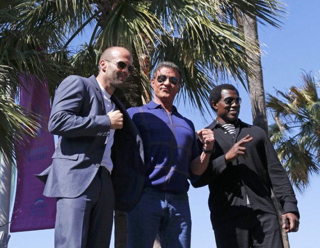 Cast members Jason Statham, Sylvester Stallone and Wesley Snipes pose on a tank as they arrive on the Croisette to promote the film 'The Expendables 3' during the 67th Cannes Film Festival. (Source: Reuters)