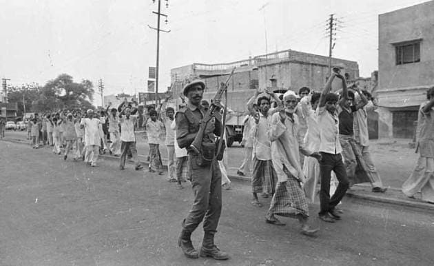 The Army rounding up men in Hashimpura: Those were tense days, especially in Meerut. The Rajiv Gandhi government had ordered the locks on the Babri Masjid to be opened and riots and killings were reported from several parts of the district. (Source: Praveen Jain)