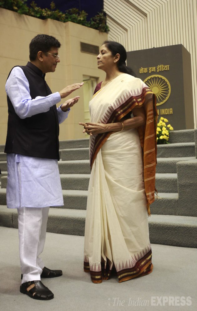 BJP leaders Nirmala Sitharam and Piyush Goel in conversation with each other. (Source: Express photo by Neeraj Priyadarshi)