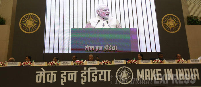 Prime Minister Narendra Modi on Thursday launched the ‘Make in India’ campaign in Vigyan Bhavan, New Delhi. (Source: Express photo by Neeraj Priyadarshi)