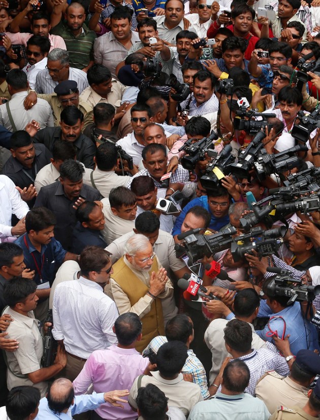 Narendra Modi is surrounded by media as he leaves his mother's residence. (AP)