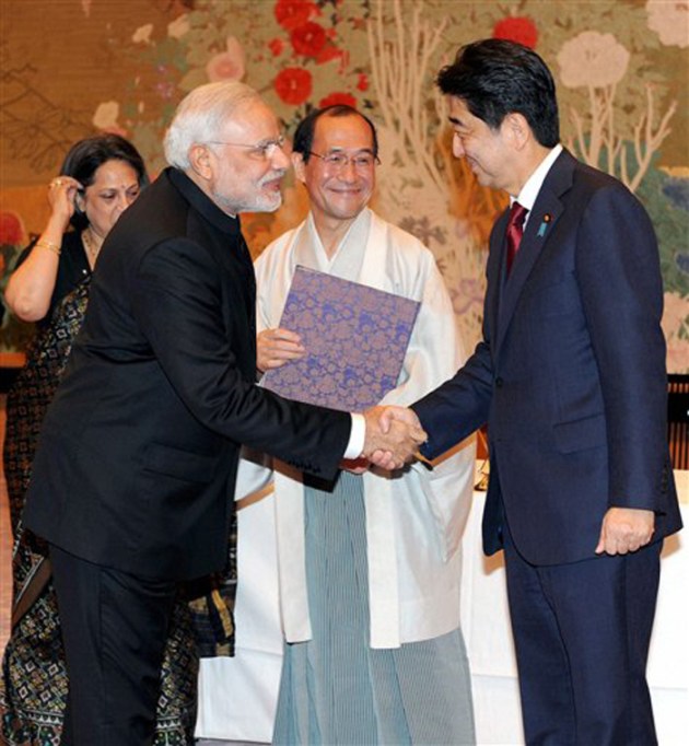 Prime Minister Narendra Modi, right, poses with his Japanese counterpart Shinzo Abe for photographers at State Guest House in Kyoto, western Japan, Saturday, Aug. 30, 2014. (Source: AP photo)