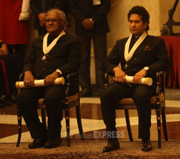 Tendulkar (40) and Rao (79), both of whom are recipients of Padma Vibhushan -- the country's second highest civilian honour, will join a list of 41 eminent personalities who have been conferred with the award that is given in recognition of exceptional service of the highest order since it was instituted in 1954. (IE Photo: Neeraj Priyadarshi)
