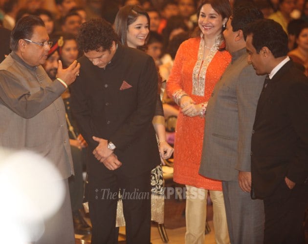 The President presented the honours at a brief function at Rashtrapati Bhavan's Durbar Hall attended by Vice President Hamid Ansari, Union ministers, Sachin's wife Anjali, daughter Sara and a host of dignitaries. (IE Photo: Neeraj Priyadarshi)