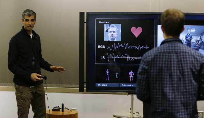 Kinect Group Program Manager Scott Evans (R), demonstrates the newest generation Kinect sensor. (AP)