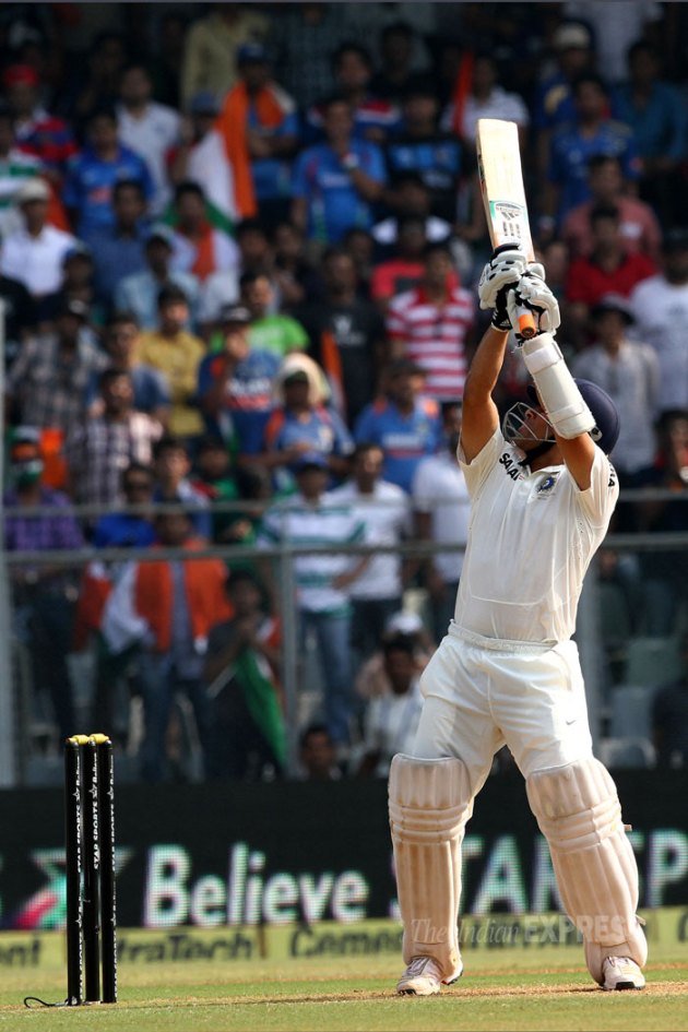 The cobwebs were off his mind, 40,000 odd at the Wankhede and the millions in every nook and corner of India may have felt the pressure, but the man himself had a sage like presence at the crease. Nothing mattered to him apart from the bowler and the release of his delivery. (IE Photo: Neeraj Priyadarshi)