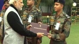 New Delhi, Jan 16 (ANI): Prime Minister Narendra Modi presented certificates to Indian Army officers for their innovative works on the occasion of Army Day. The officers were honoured for their contributions in the areas of communications, counter-militant operations and others. The 'At-Home function' held in New Delhi was attended by President Pranab Mukherjee, Defence Minister Manohar Parrikar, former prime minister Manmohan Singh, Congress president Sonia Gandhi and others. Army Day is observed every year on January 15 to commemorate Field Marshal K. M. Cariappa's taking over as the first Commander-in-Chief of the Indian Army from Sir Francis Butcher, the last British commander, in 1949.