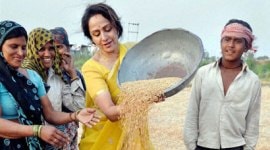 Hema Malini tries winnowing of wheat during her election campaign.
