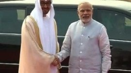 New Delhi, Feb 11 (ANI): A ceremonial reception was held at the Forecourt, Rashtrapati Bhavan, for Crown Prince of Abu Dhabi Sheikh Mohammed Bin Zayed Al Nahyan on Thursday. Prime Minister Narendra Modi, External Affairs Minister Sushma Swaraj, Finance Minister Arun Jaitley, Home Minister Rajnath Singh were among others present at the ceremony. Sheikh Mohammed Al Nahyan arrived in New Delhi on Wednesday evening on a three-day visit.