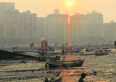 The sun has set hours ago and a pandal near the jetty at Badhwar Park is brightly lit for a religious event that appears to be winding up. Along the road that has traffic zooming past it are fishing trawlers, some turned upside down, for repair. Like they do every evening, three elderly fishermen sit on an upturned boat catching up on the day’s events after dinner.