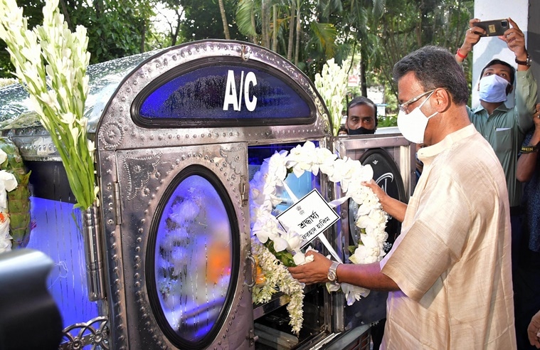 The last journey: Minister Firhad Hakim paying tributes to Buddhadeb Guha. (Express Photo)