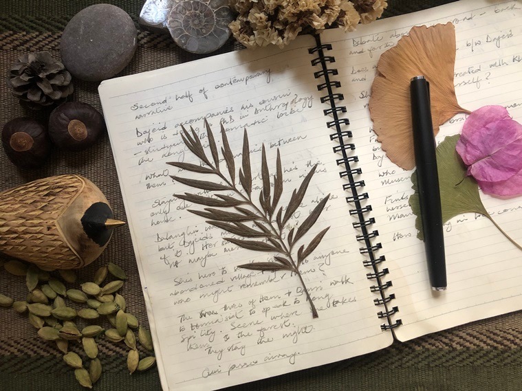 I love it. Here, I feel at home, and am nowhere happier than sitting at my table, which holds an assortment of knick-knacks for comfort and inspiration. I’m quite a tidy person, though I enjoy a gentle “planned disarray” on my table top — a line of test tubes holding dried leaves, seed pods, flowers, an army of ink pots, stones collected from walks along rivers and beaches, pine cones from the mountains, an amber ammonite fossil gifted by a friend, a small Van Gogh box, a wooden hand-carved bird named Omija, a metal stag from the Crafts Museum, a terrarium in which a lone succulent survives, and, of course, an assortment of fountain pens and notebooks.