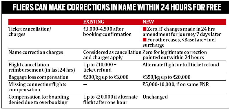The passenger charter also prescribes uniform penalties on carriers for poor services such as missing connecting flights and denial of boarding due to overbooking. Passengers can now also make legitimate corrections in their name within 24 hours of booking without paying any charges. Currently, any change or correction in name is considered as cancellation and charges apply. A traveller has to then book a new ticket. The compensation for loss or damage to baggage has been fixed at Rs 350 per kg, nearly 75 per cent more than what airlines usually pay now. The upper limit for compensation has been enhanced to Rs 20,000, up from Rs 3,000 currently.