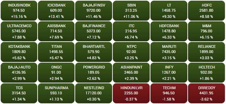 The S&P BSE Sensex settled at 48,600.61, rallying by 2,314.84 points (5.0 per cent), while the Nifty 50 surged 646.60 points (4.74 per cent) to end at 14,281.20.