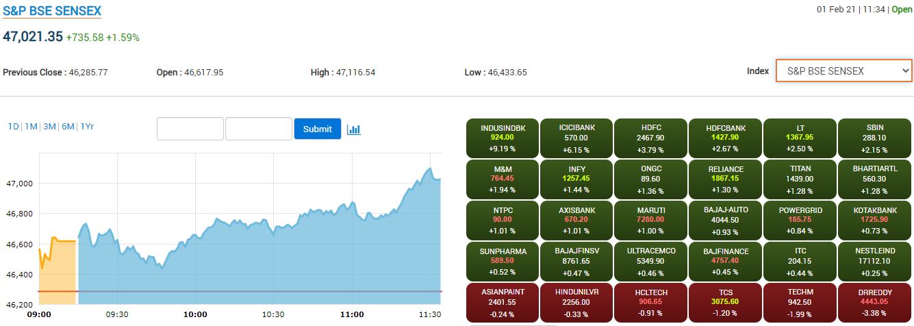 Sensex is trading over 500 points higher ahead of the presentation of the Union Budget 2021 in Parliament.