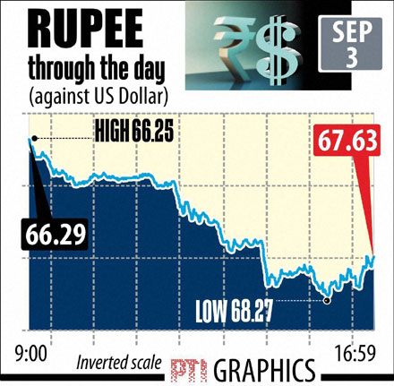 The Indian rupee closed at 67.065/075 to the US dollar as against Tuesday’s close of 67.63/64. It had fallen to 68.62 in early session,not far from its record low of 68.85 seen last week.