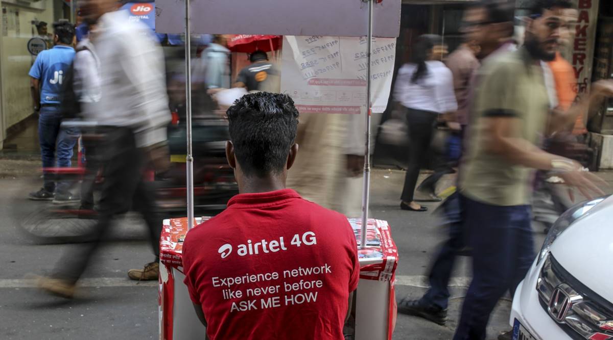 A Bharti Airtel Ltd. employee waits for customers at a street stall in Mumbai, India, on Monday, Feb. 3, 2020. (Photographer: Dhiraj Singh/Bloomberg)