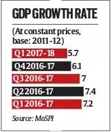Overall slide in economic growth, which began in July-September quarter last year, was accentuated by demonetisation in the following quarter and challenges posed by implementation of the GST six months later. Growth in gross domestic product (GDP) has fallen to 5.7 per cent in April-June 2017, from 7.9 per cent in April-June 2016, after falling consistently during each quarter in the intervening period.