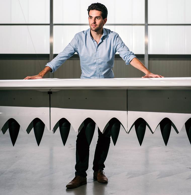 Daniel Wiegand, the chief executive of Lilium, leans on a wing of the company’s prototype flying taxi in a hangar in Wessling, Germany on Oct. 10, 2019. Lilium, a German start-up, illustrates the potential and the risks of creating a new generation of electric aircraft for urban transportation. (The New York Times)