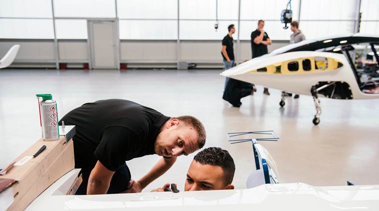 Lilium employees work on a disassembled wing of the company’s prototype flying taxi in a hangar in Wessling, Germany on Oct. 10, 2019. Lilium, a German start-up, illustrates the potential and the risks of creating a new generation of electric aircraft for urban transportation. (The New York Times)