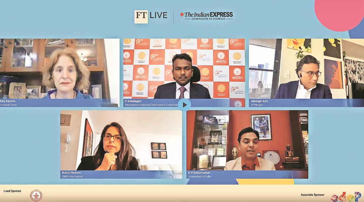 Clockwise from top left: Amy Kazmin, South Asia Bureau Chief—Financial Times; P Anbalagan, CEO, Maharashtra Industrial Development Corporation; Jahangir Aziz, Head—Emerging Markets Economics, JP Morgan; K V Subramanian, Chief Economic Adviser; and Rohini Malkani, Senior Vice President, Credit Ratings, Global Sovereign Ratings, DBRS Morningstar. (Screengrab)