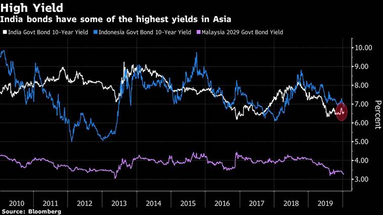 Despite five interest-rate cuts last year to shore up growth, yields on 10-year India bonds remain some of the highest in Asia at 6.64%.