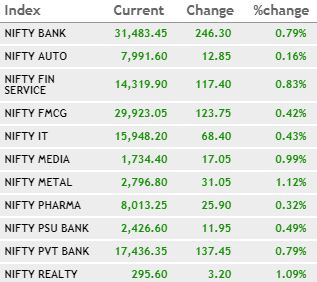 Among the sectoral indices on the National Stock Exchange (NSE), the Nifty Metal index was the top gainer climbing over 1.1 per cent at noon. It was closely followed by the Nifty Realty index.