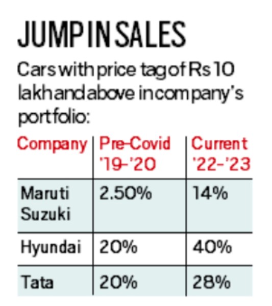 For market leader Maruti Suzuki, cars costing Rs 10 lakh and above (the premium segment), as a percentage of its total portfolio of models, have grown from just 2.5% in FY20 to 14% during the current fiscal. For Hyundai, that jump is from 20% to 40%; and for Tata Motors, it’s from 20 to 28%.