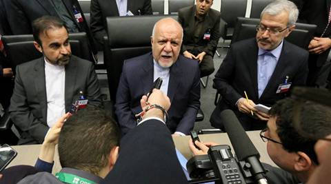 Iran’s Minister of Petroleum Bijan Namdar Zangeneh, center, speaks to journalists prior to the OPEC meeting. (Source: AP)