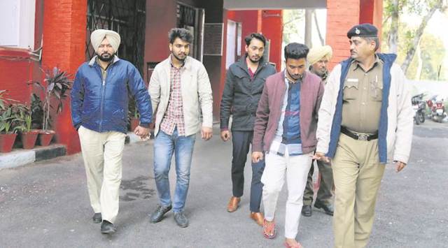 Three accused at Sector 36 Police Station in Chandigarh on Tuesday. (Express Photo by Sahil Walia)