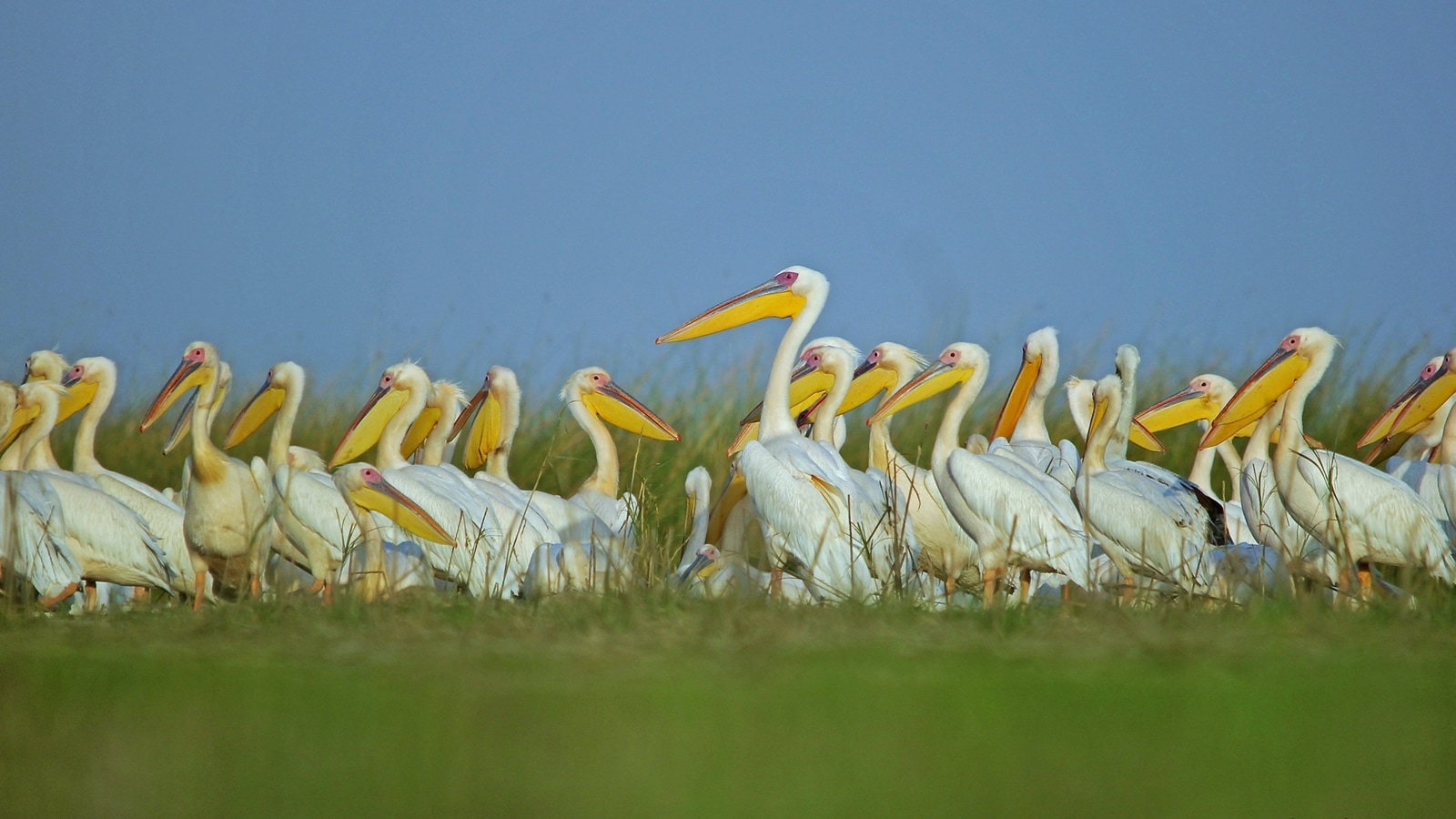 A flock of great white pelicans at Gosabara-Mokarsagar wetland complex in Porbandar. Special Arrangement