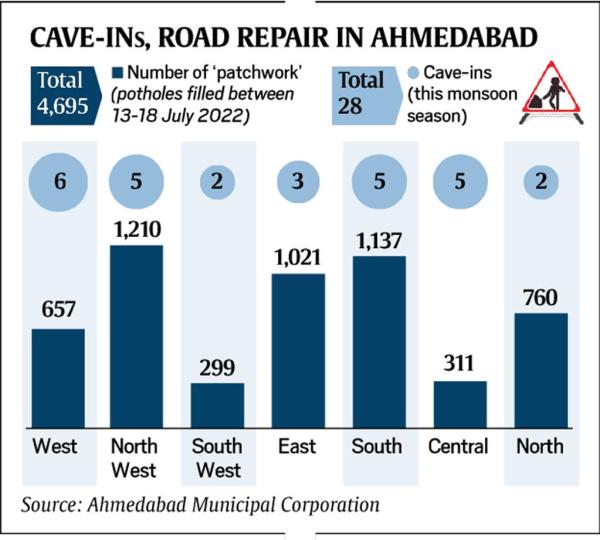 Last week, another major cave-in was reported in Shahibaug area where a car sank. The highest number of six cave-ins were reported from the West zone, followed by five each in the South, Central and North West zones, three in the East zone, two each in South West and North zone, and two cave-ins in East zone.
