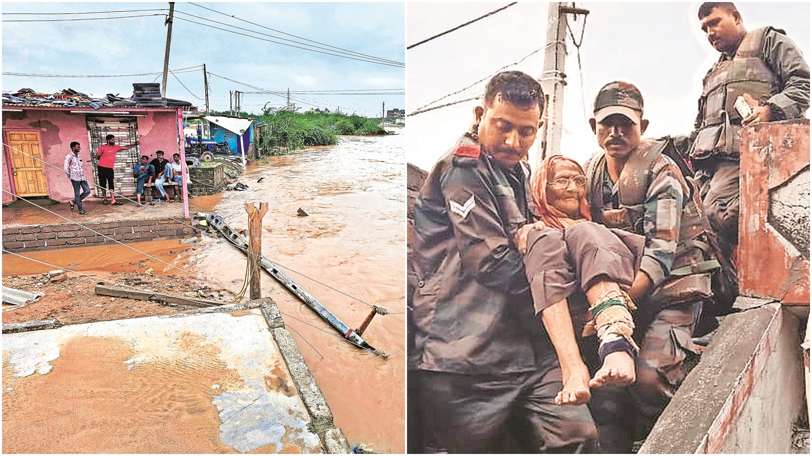 (LtoR) A flooded area at Kothara village in Kutch district on Friday, Army and NDRF rescue people from flood-hit areas after heavy rain in Khambhalia in Devbhoomi Dwarka