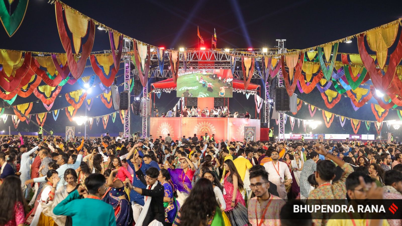 Revellers play garba at the Lukshmi Vilas Palace Heritage held at Moti Baug Cricket Ground. (Express Photo)