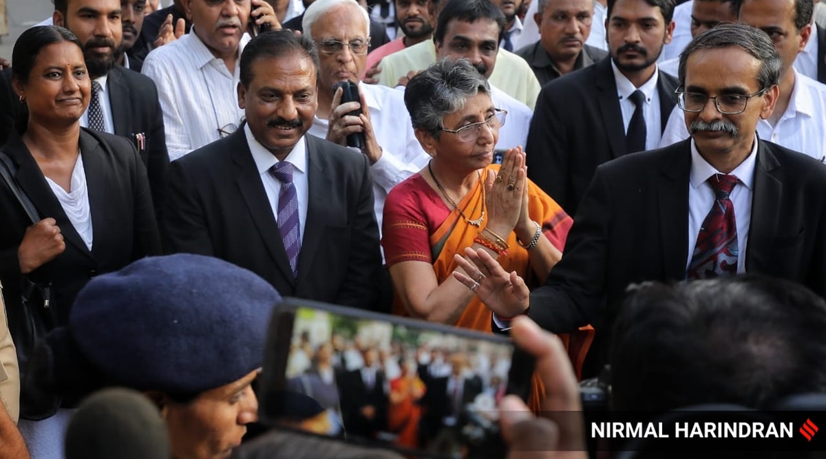 Former BJP MLA Maya Kodnani outside the court in Ahmedabad after being acquitted in the 2002 Naroda Gam massacre case. (Express Photo: Nirmal Harindran)