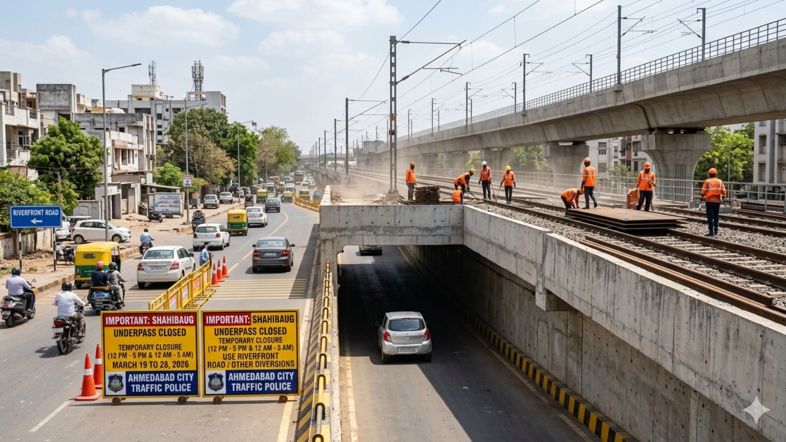 The three-way Shahibaug underpass in Ahmedabad will remain intermittently closed for all vehicular traffic between 12 pm and 5 pm and 12 am and 5 am for 10 days, from March 19 to March 28, as railway authorities carry out track strengthening and plate replacement work on the line above the underpass.
