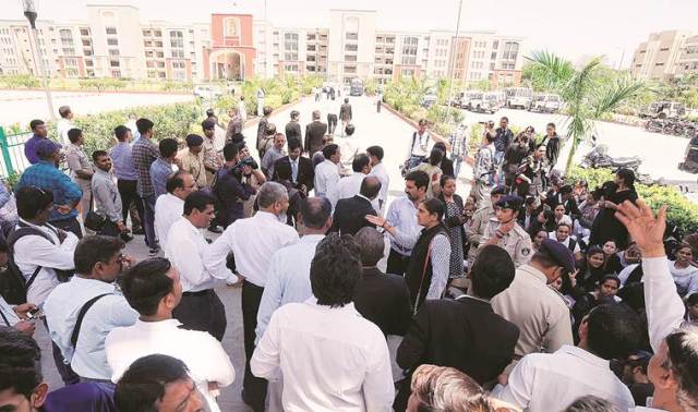 Broken window panes, doors and furniture remind of the commotion that the new building witnessed from the very first day — March 19 — when over 2,500 lawyers began their protest. The stalemate continued for a week, and was resolved only after a committee of senior lawyers met the Chief Justice of Gujarat High Court. The agitating advocates finally agreed to resume work, but they continue to protest in their unique way.