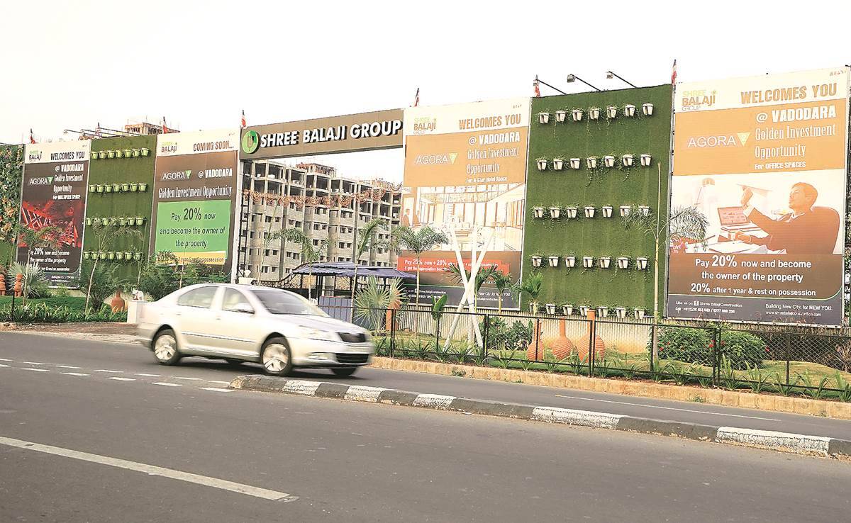 An on-site hoarding of Agora-2 in Vadodara. (Express Photo by Bhupendra Rana)