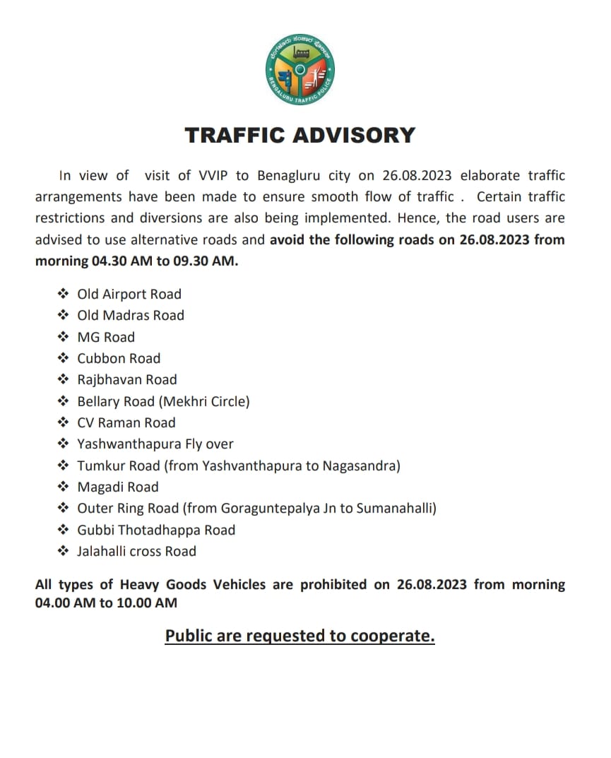 Traffic restrictions were announced in Bengaluru Friday for the morning of August 26 on account of the visit of Prime Minister Narendra Modi to ISRO's Telemetry, Tracking and Control Center in Peenya to congratulate the space research organisation's scientists for the successful soft landing on the moon of the Chandrayaan-3 lander module. Check out the full list here: