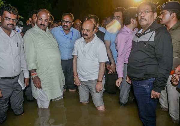 Chief Minister Basavaraj Bommai inspects rain-hit Rainbow drive and Yamalur areas.
