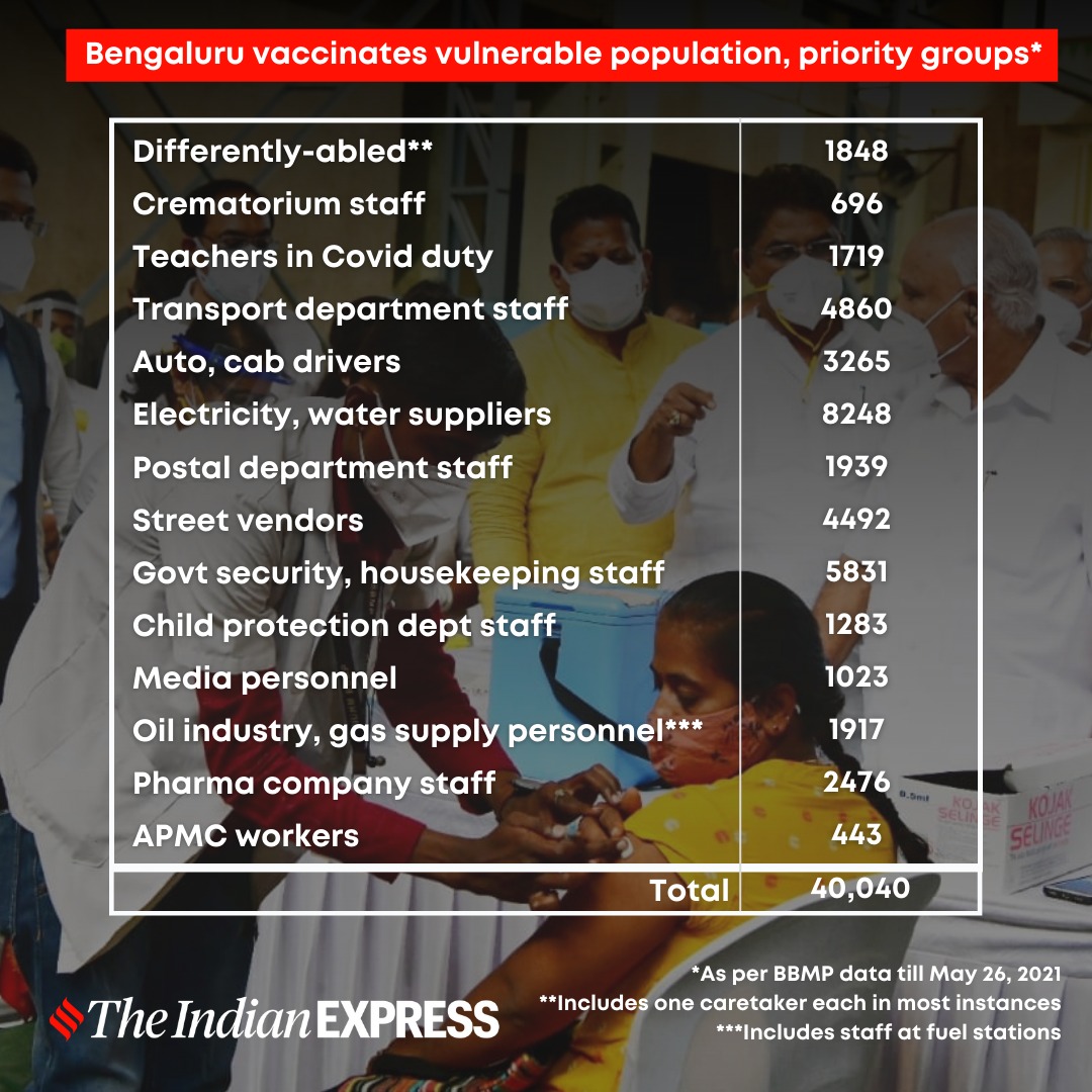 As per numbers shared by the Bruhat Bengaluru Mahanagara Palike (BBMP), which is in charge of the vaccination drive in the city, as many as 40,040 beneficiaries from across categories were inoculated till May 26. This included 1848 people (with one caretaker each in most instances) who are differently-abled, 4492 street vendors, 3265 autorickshaw and cab drivers, 8248 electricity and water suppliers, and 5831 security and housekeeping staff from government offices among others.