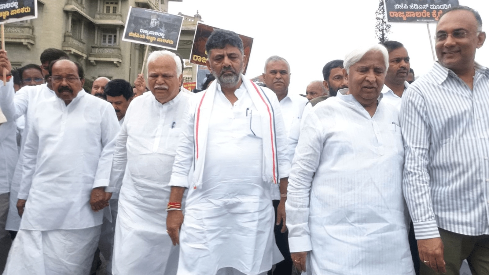 Holding placards, banners, posters and raising slogans condemning Governor Thaawarchand Gehlot, the Congress leaders led by Shivakumar took out a march, which saw the participation of several ministers, Congress MLAs and MPs.