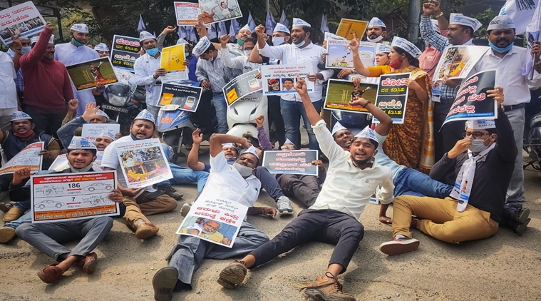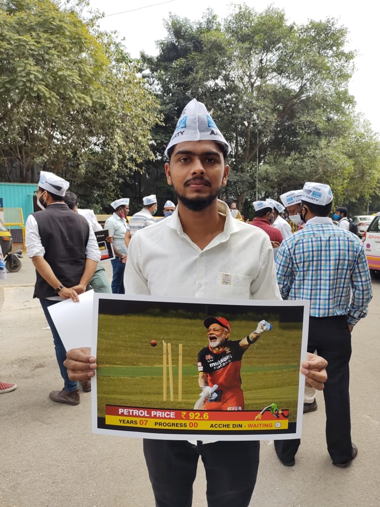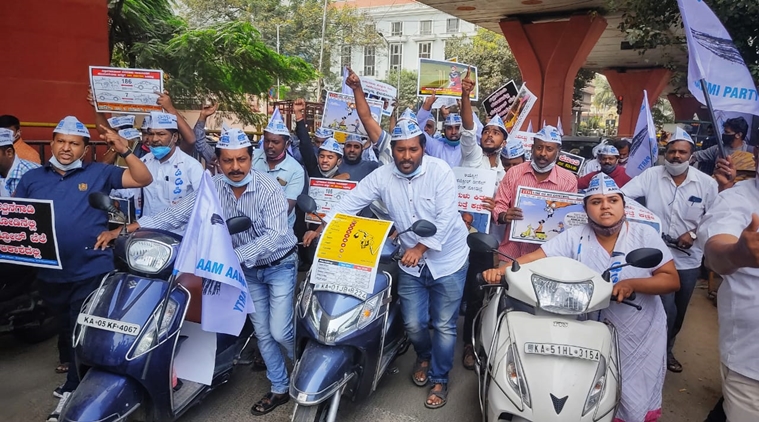 Members of the Aam Aadmi Party carried out a protest at Maurya Circle in Bengaluru protesting fuel price hikes. Protesters were seen pushing their vehicles and shouting slogans against the Modi-led government at the Centre and Yediyurappa-led government in the State for "troubling citizens further amid the pandemic with fuel prices skyrocketing frequently."