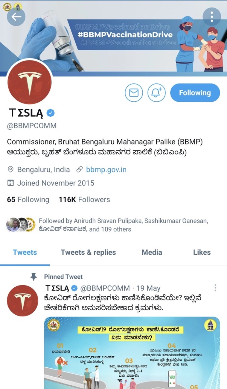 The display name of the account was later changed to ‘–’. BBMP sources confirmed to Indianexpress.com that the Bengaluru civic body commissioner’s account was hacked and they are in the process of retrieving it.
